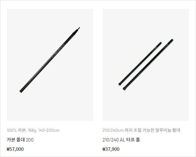 알루미늄 폴대는 190~240cm (720g) / 160~210cm (570g)의 두 가지 모델로 나오고 심지어 케이스도 별매다.