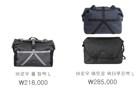 '버로우 롤 탑백', '버로우 매트로 워터루프백'.