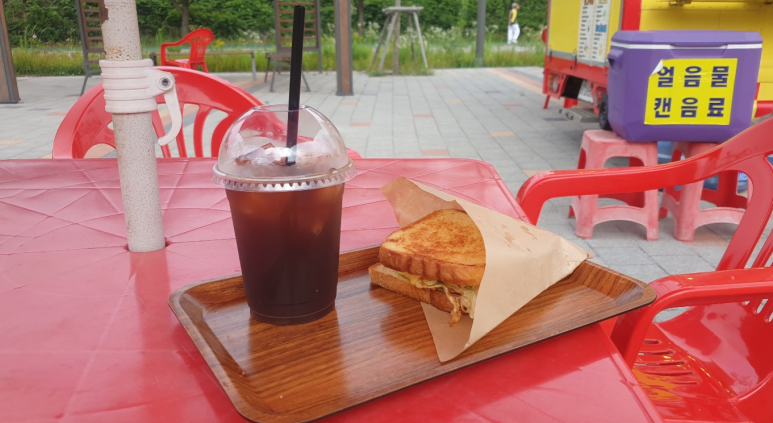 미사리에서 아점으로 토스트와 아메리카노를 주문 했는데 역시 전날 워크샵에서의 음주로 인해 신문지 씹는 느낌이 든다.