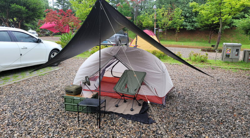 비가 퍼붓다가 피칭할 때는 다행이도 비가 소강상태가 되었다. 그래도 몇번 타프를 쳐보았기에 버벅임 없이 타프를 칠 수 있었고, 첫 개봉인 '몽가2'도 어렵지 않게 피칭할 수 있었다.